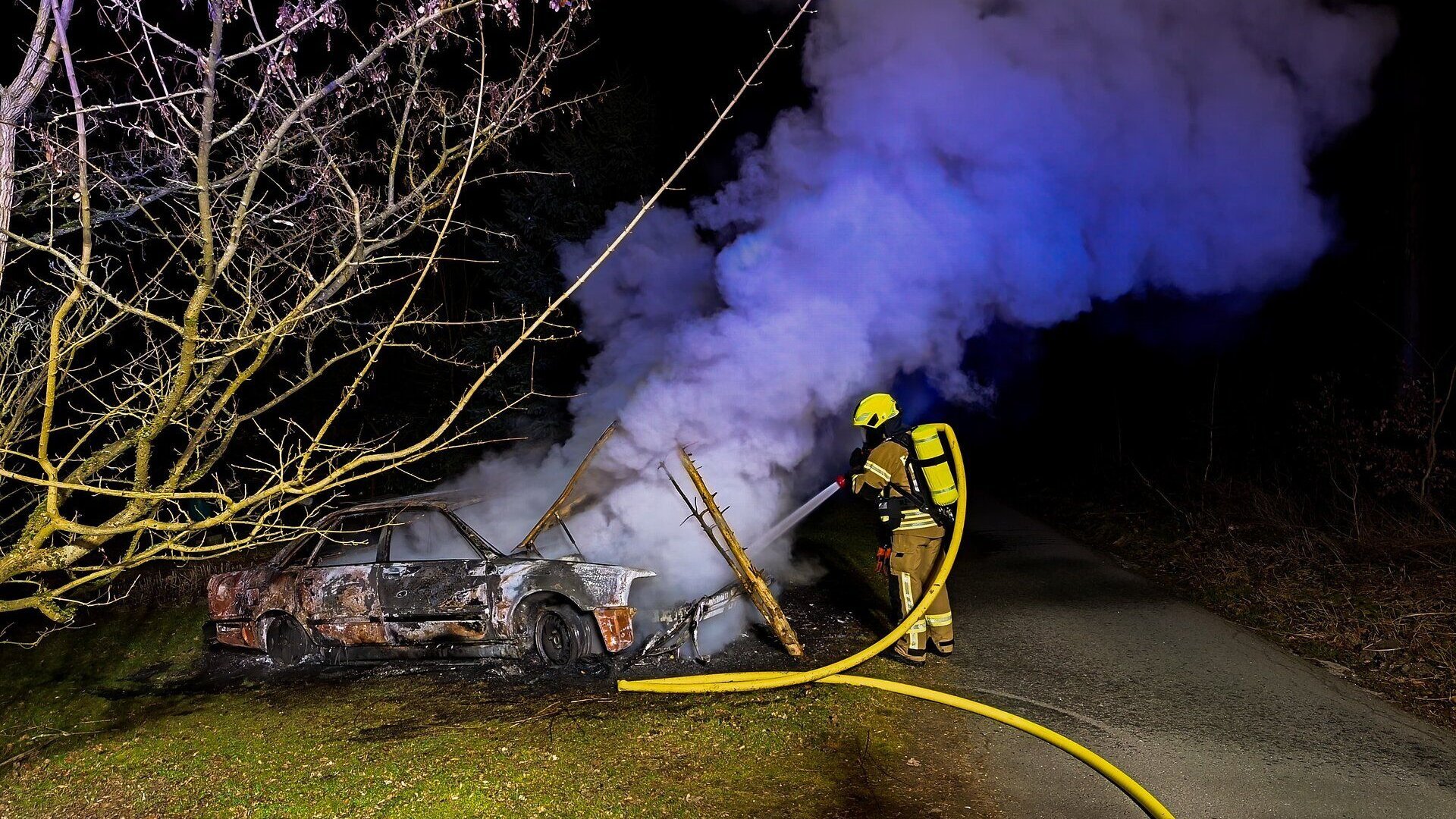Um kurz nach Mitternacht habe eine Frau das Feuer bemerkt, beim Eintreffen der Polizei habe der nicht mehr zugelassene Wagen schon in Vollbrand gestanden.