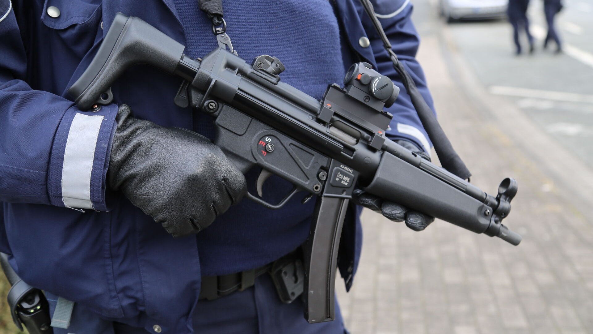 Unter anderem SEK-Leute haben sich mit Schutzschildern und Maschinenpistolen rund um den Hof postiert.
